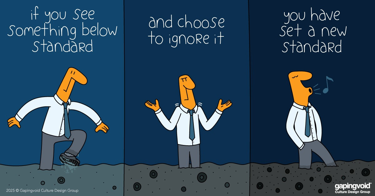I clipped this below graphic from a recent Gapingvoid post and set it as my laptop wallpaper to remind myself every day: it is not okay to be okay with lowering the bar. Not on quality. Not on morality.