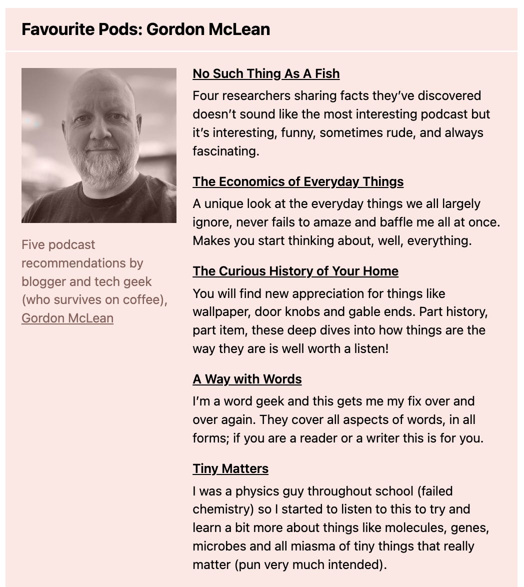 If you are looking to add new podcasts to your diet, especially ones that do not preach or tell you how to live, but instead help you notice and enjoy the small things in life, you will likely find something worth picking up here.