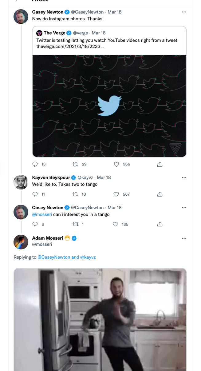 “People don't live on one product,” Beykpour said, noting that Twitter had also launched an integration with Snapchat last December. “They’re navigating in between them. So making those traversals feel convenient and colorful, I think, is important.”