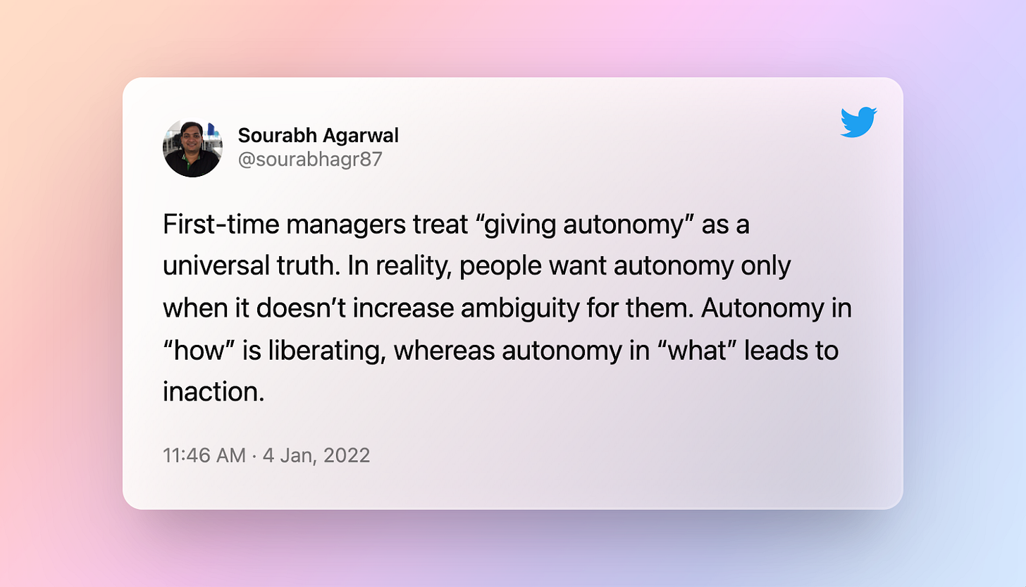 Before we sign off, here's a snapshot of a tweet worth saving. Sourabh articulated the nuance around ‘giving autonomy’ very well. I will recommend it to all managers (and not only first-time managers).