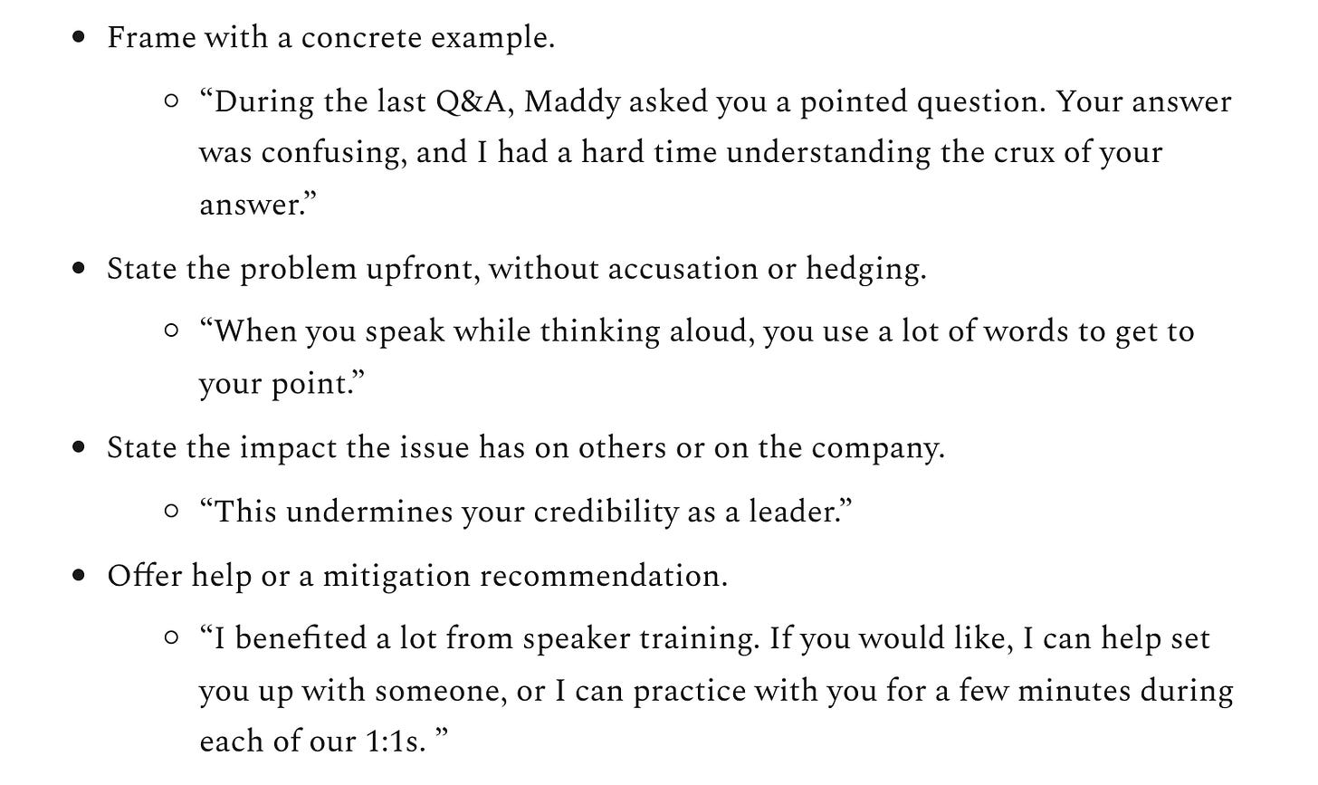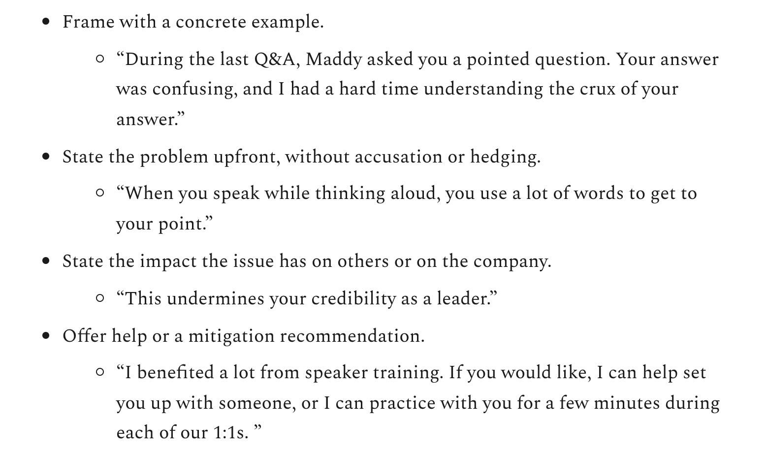 Making plainspokenness common practice requires providing a sense of psychological safety, without fear of blowback. If your company incentivizes speaking in riddles, or with a polite “yes” when you actually mean “no”, then that is what you will get more of. If, on the other hand, you encourage dealing with issues directly and speaking the truth with clarity, that will become the cultural norm. Most people don’t hide the truth because they have bad intentions, but rather because they have been trained to believe that this is the better path. They are worried that bad news will cause them to be judged harshly or that senior leaders will be disappointed or upset.