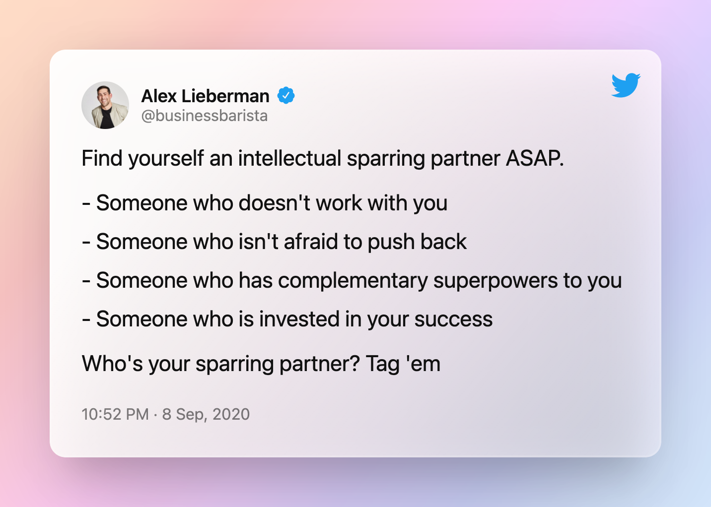 An intellectual sparring partner is a friend, colleague, or acquaintance whose combination of background, competency, and personality makes them well-suited to strengthen the quality of your reasoning and decision-making via active, grounded discussion and debate.