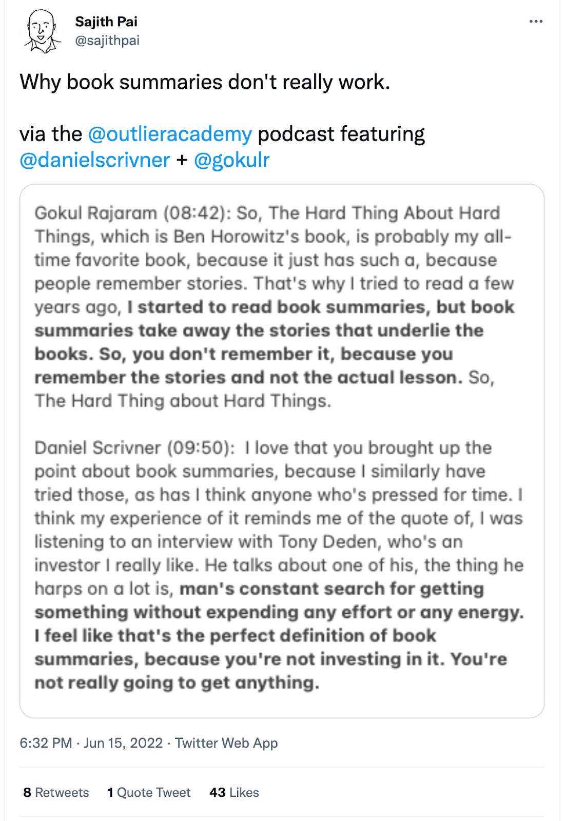 Before we sign off, here’s a thought around book summaries from Sajith Pai. They are like cheatsheets from your Maths 101 courses. They contain the summary for quick recall, but you may not do a good application if you started your learning directly from them.