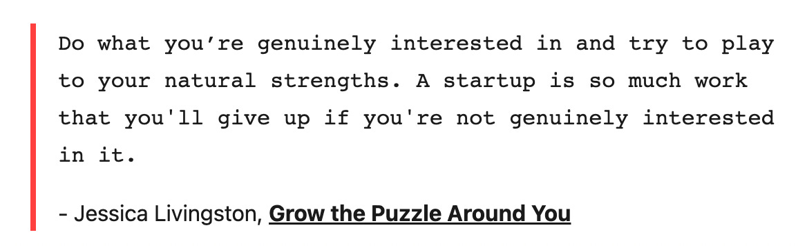 Do what you’re genuinely interested in and try to play to your natural strengths. A startup is so much work that you'll give up if you're not genuinely interested in it.