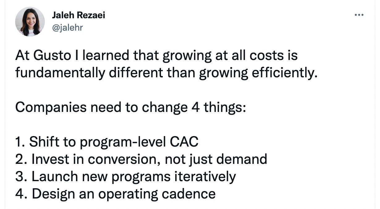 Continuing on the theme of growth & customer retention with this twitter thread from Jaleh Rezaei. She recalls 4 key lessons from during her stint as the Head of Marketing at Gusto. Here’s the tweet that captures the essence.