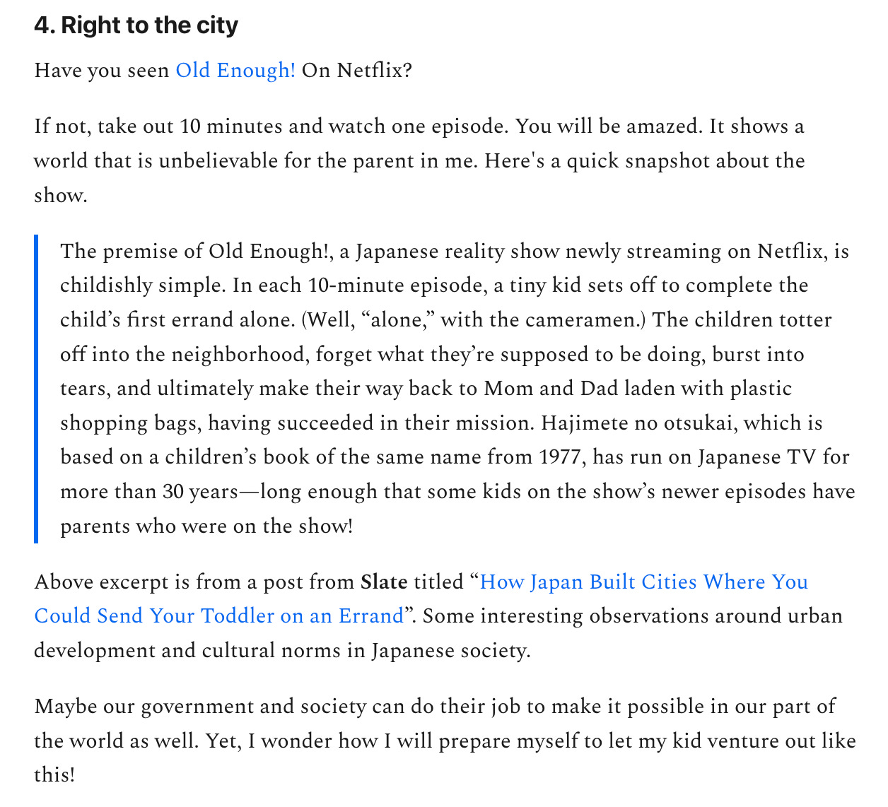 In #51, we had discovered Netflix’s series “Old Enough” and the concerning discussion around the right to the city. Here’s a snapshot from that post: