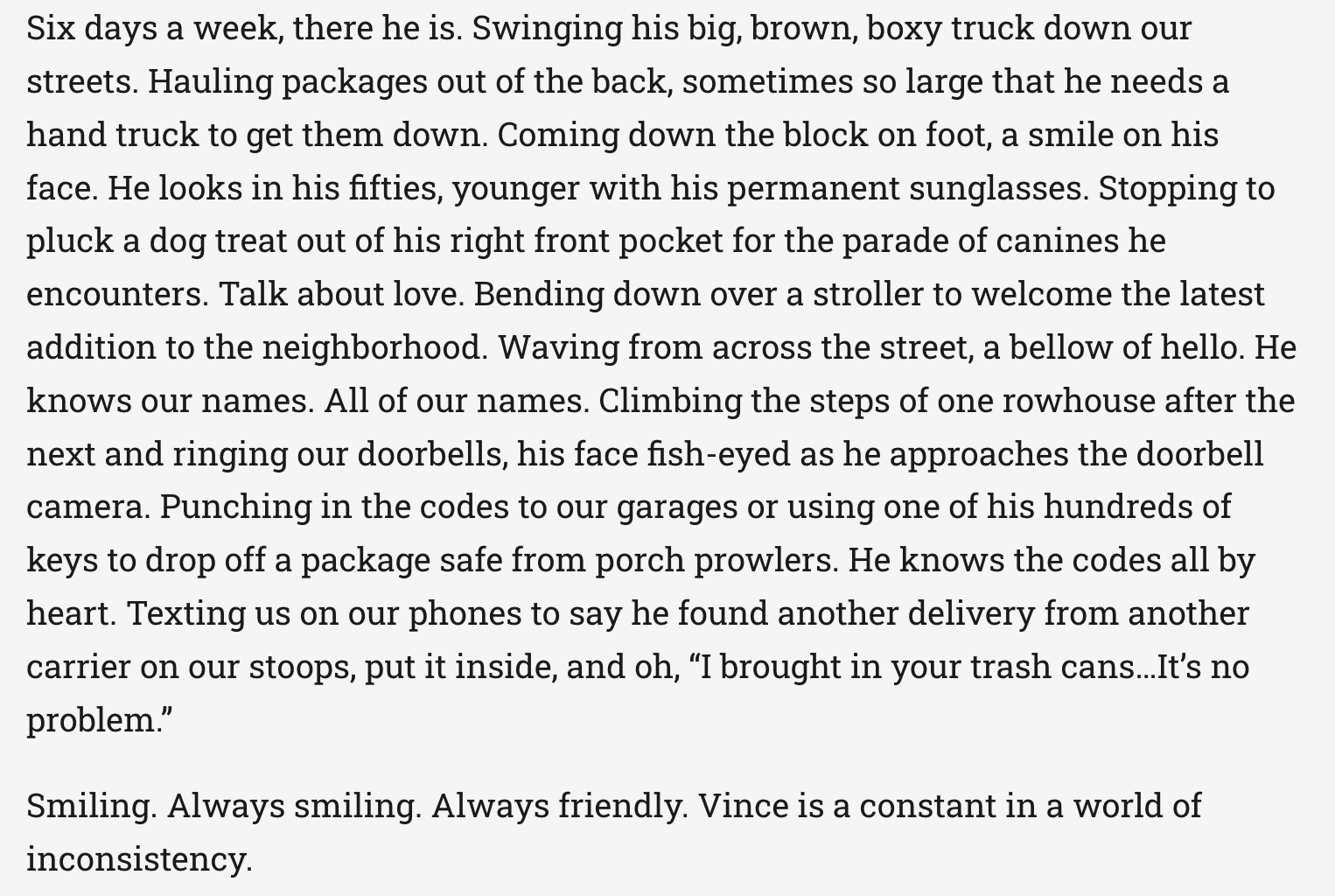 Vince’s story is a good starting point if you want to read some of their best work. Here’s Vince as his fans describe him: