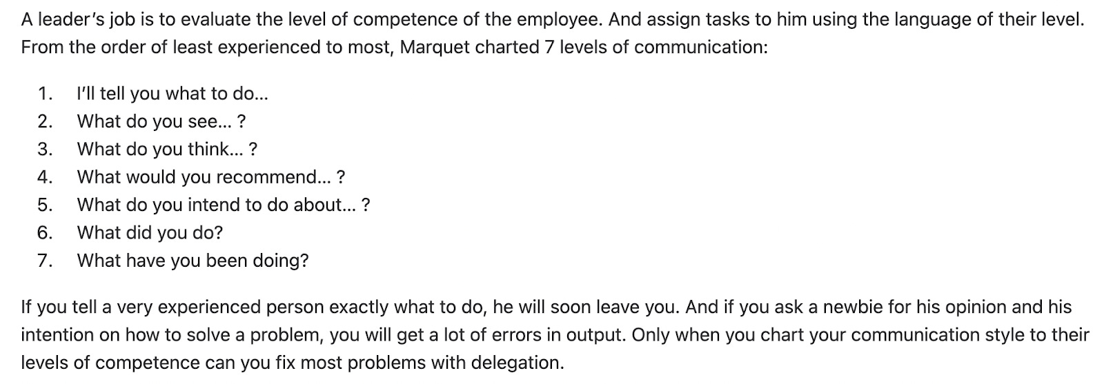 In a recent post, Ankesh had briefly covered David Marquet’s 7 leadership communication levels. Here’s a snapshot from the post: