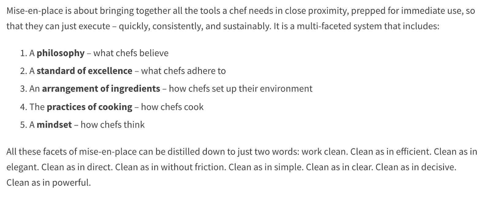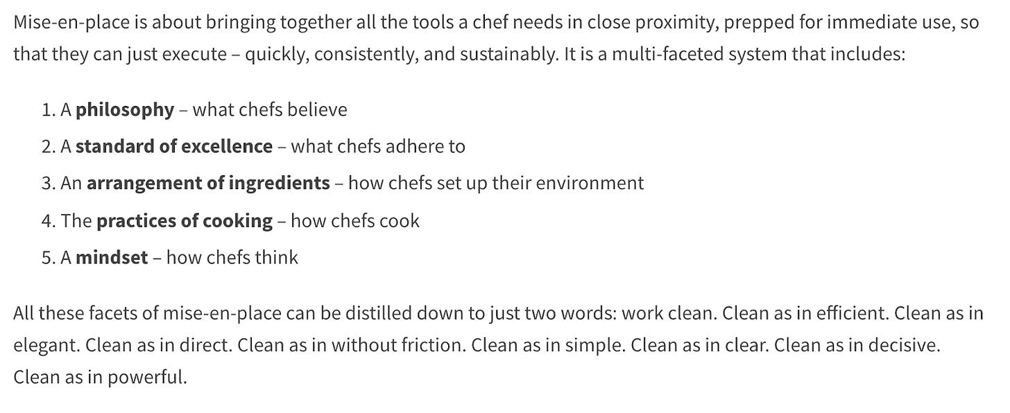 If you want to know more about Mise-en-place, below is a quick snapshot from the article. Do read the original article to enjoy the beauty of this system.