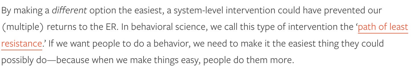 Kristen Berman recommends system-level interventions from behavioral science to reduce visits to ER. The post is written with the American healthcare system in mind, but covers a bunch of important topics that are relevant to any problem solving.