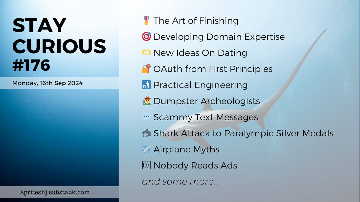 đ Art of Finishing, Developing Domain Expertise, OAuth from First Principles, Scammy Text Messages, New Ideas on Dating