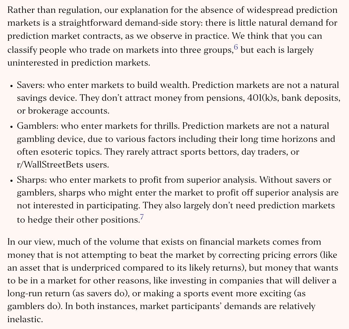 Nick Whitaker and J. Zachary Mazlishâs piece âWhy prediction markets arenât popularâ is a good primer on the topic of âPrediction Marketsâ. They go on to describe how these markets work, key players involved and how these markets donât work.Â