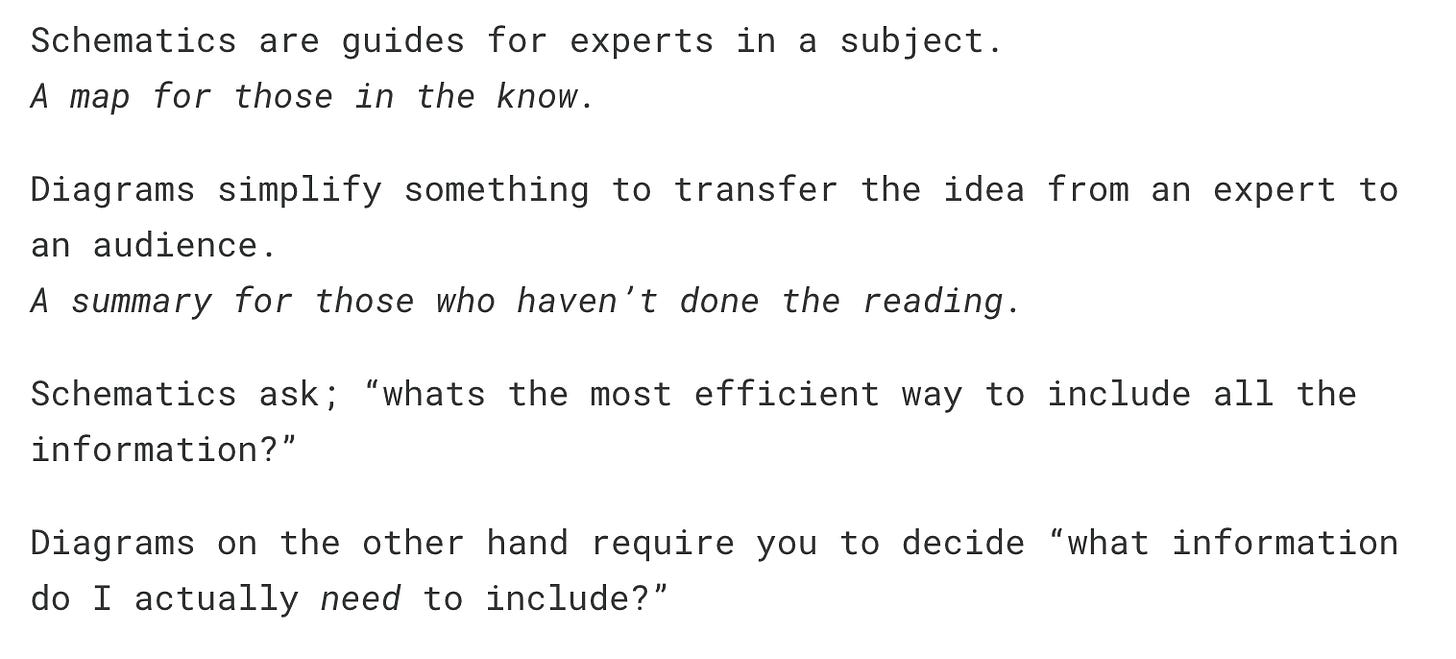 Alex Morrisâs StratScraps newsletter dished out a phenomenal one recently. Hereâre one bit that stood out: Schematics vs Diagrams