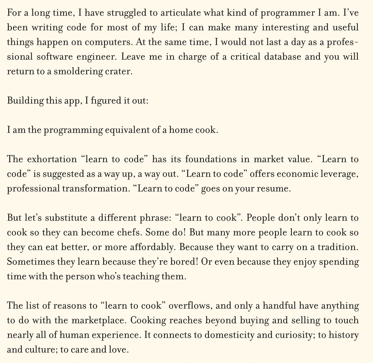 With all the AI tinkering and tool making happening again, it feels like the world is returning to home cooked apps. That can be a great thing for everyone involved, as long as we remember when we are cooking and when we are coding.
