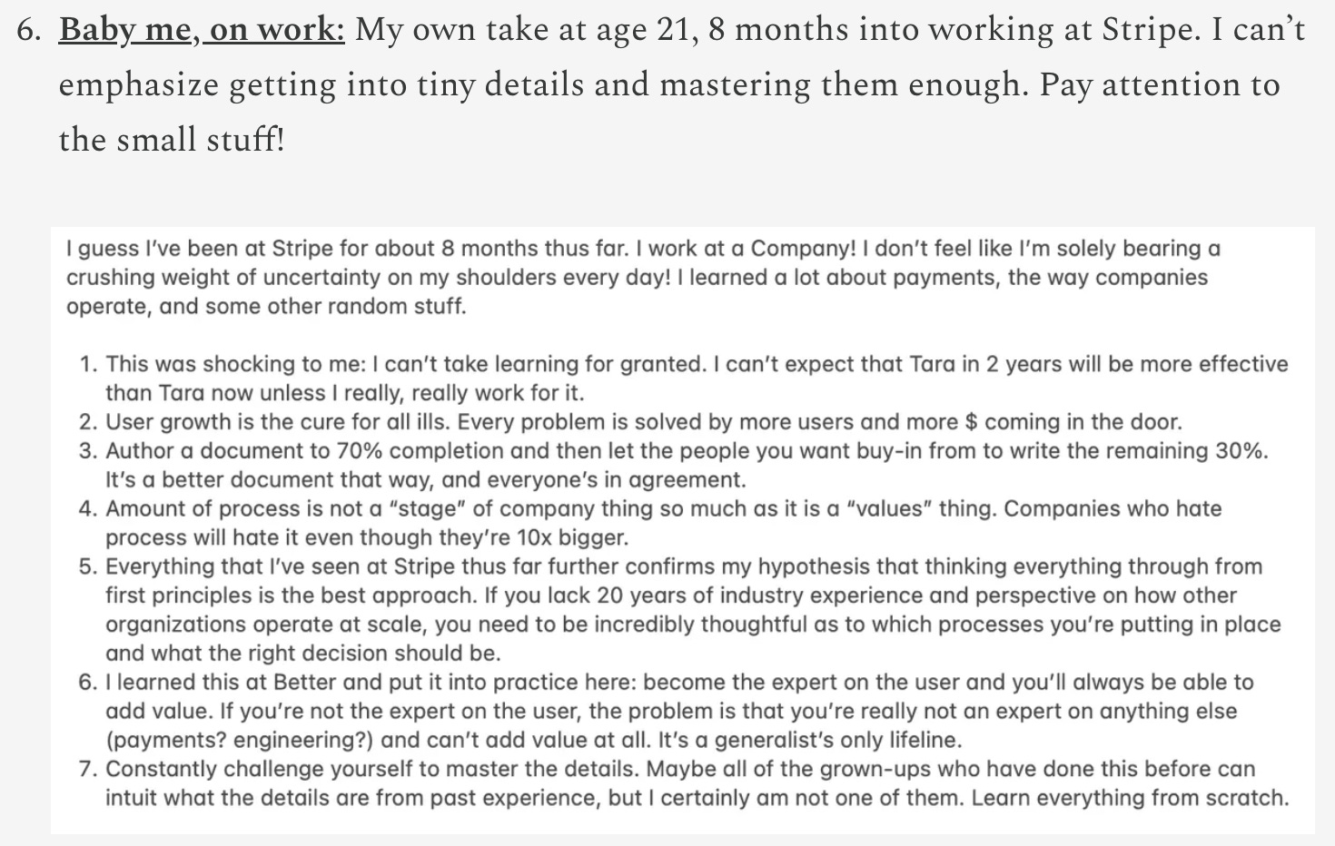 The post curates 10 great pieces, covering lessons from Tom Kalil (from Obama Administration), Molly Graham, Tyler Cowen and more. Each piece is worth a click and learning from. Here’s one quick snapshot from one of those: