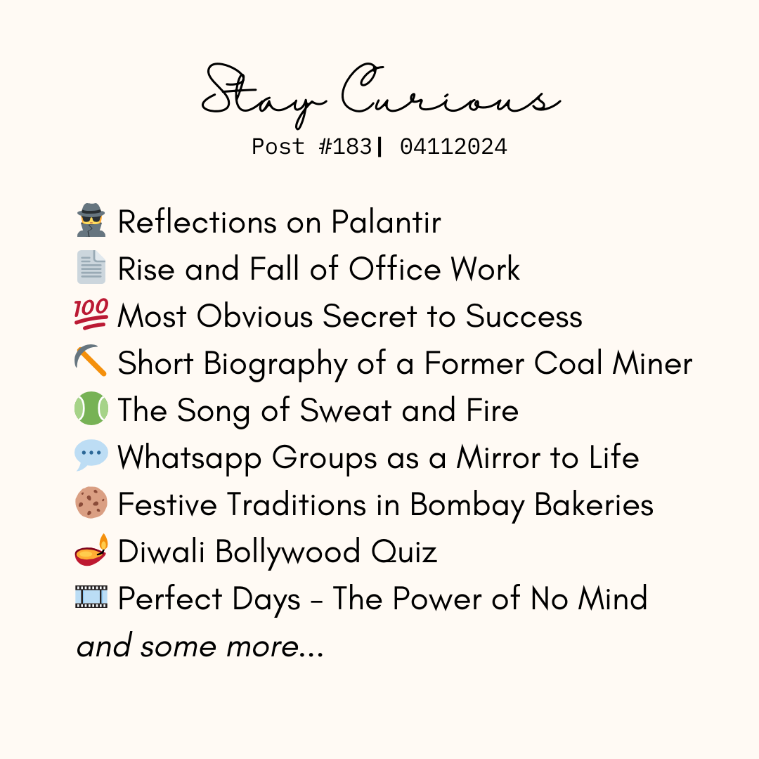 š Reflections on Palantir, Rise and fall of office work, Short biography of a former coal miner, Whatsapp groups as a mirror to life, Festive traditions in Bombay bakeries