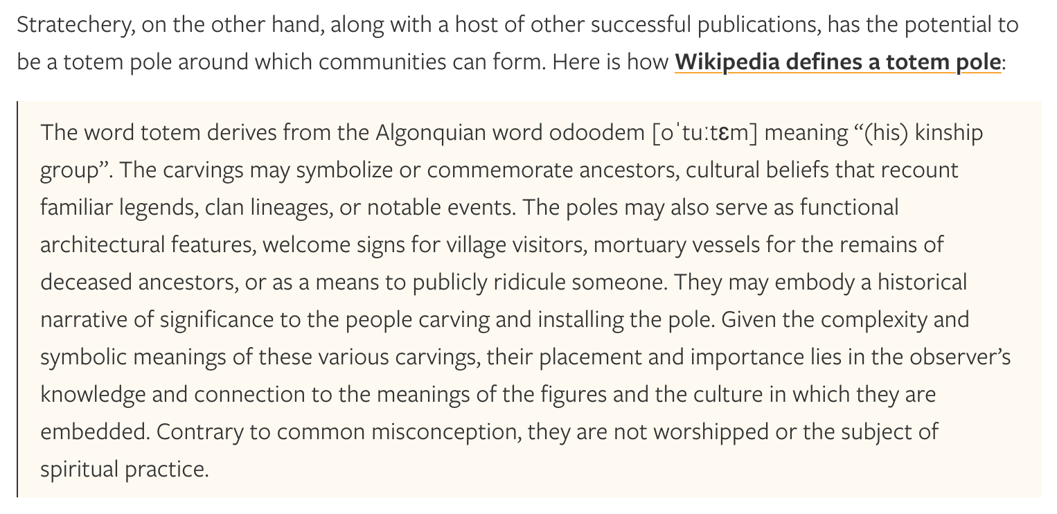 The piece lives up to its reputation. It spans the history of communication, dips into copyright law, walks through three phases of the publishing industry, and even detours into the meaning of the word totem pole.