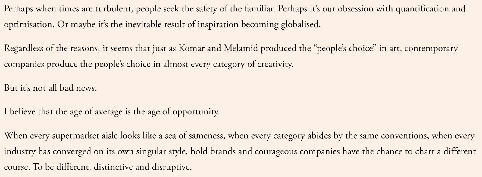 Alex Murrell’s essay “The age of average” is an uncomfortable read. It’s calling out all the ways we’ve become ‘average’ and are somehow proud about it. These are trends that are happening, right under our noses. And we’re ok about it.