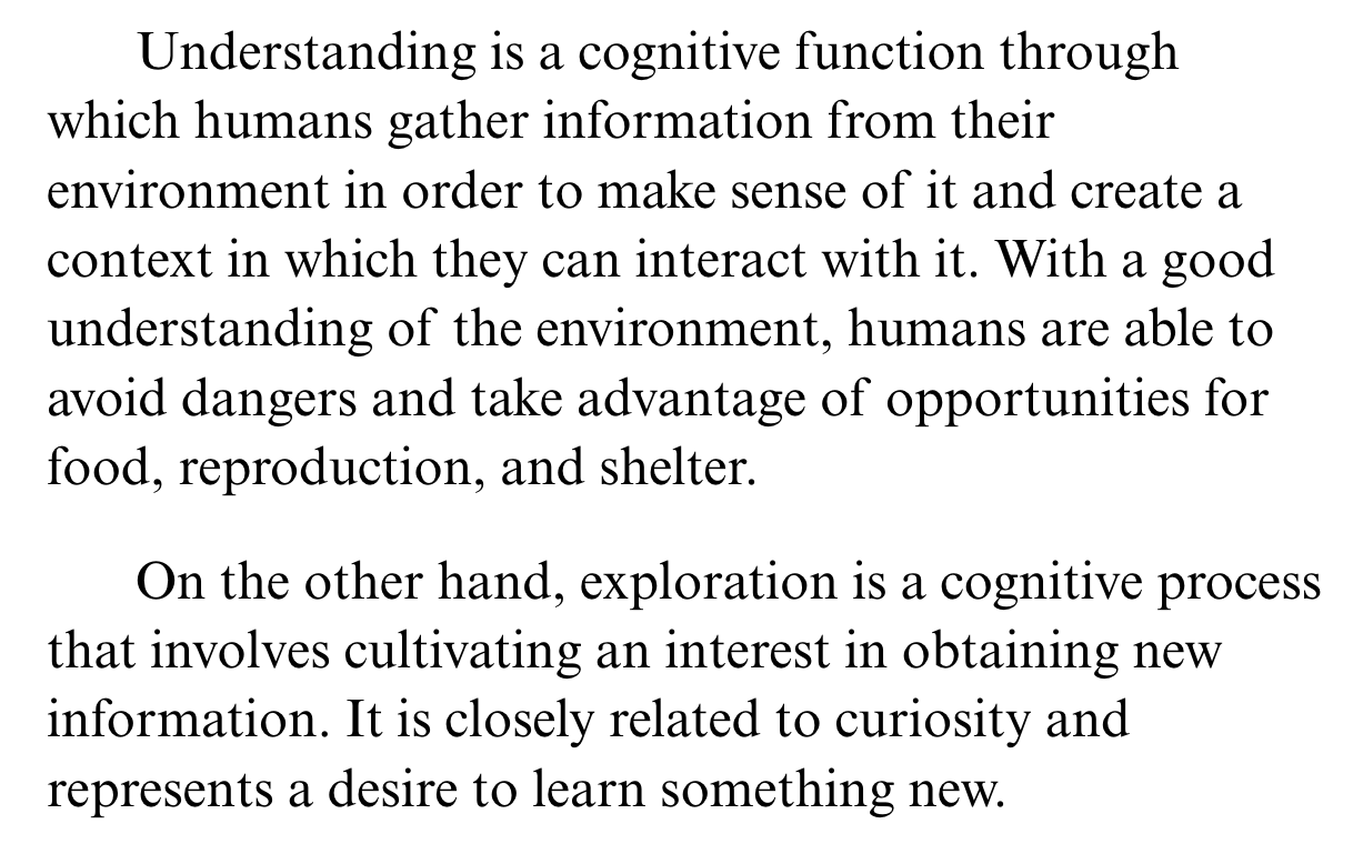 Why is this relevant for us? Blagic suggests that humans form these preferences using two cognitive functions - understanding and exploration. Below is a snippet expanding on these two.