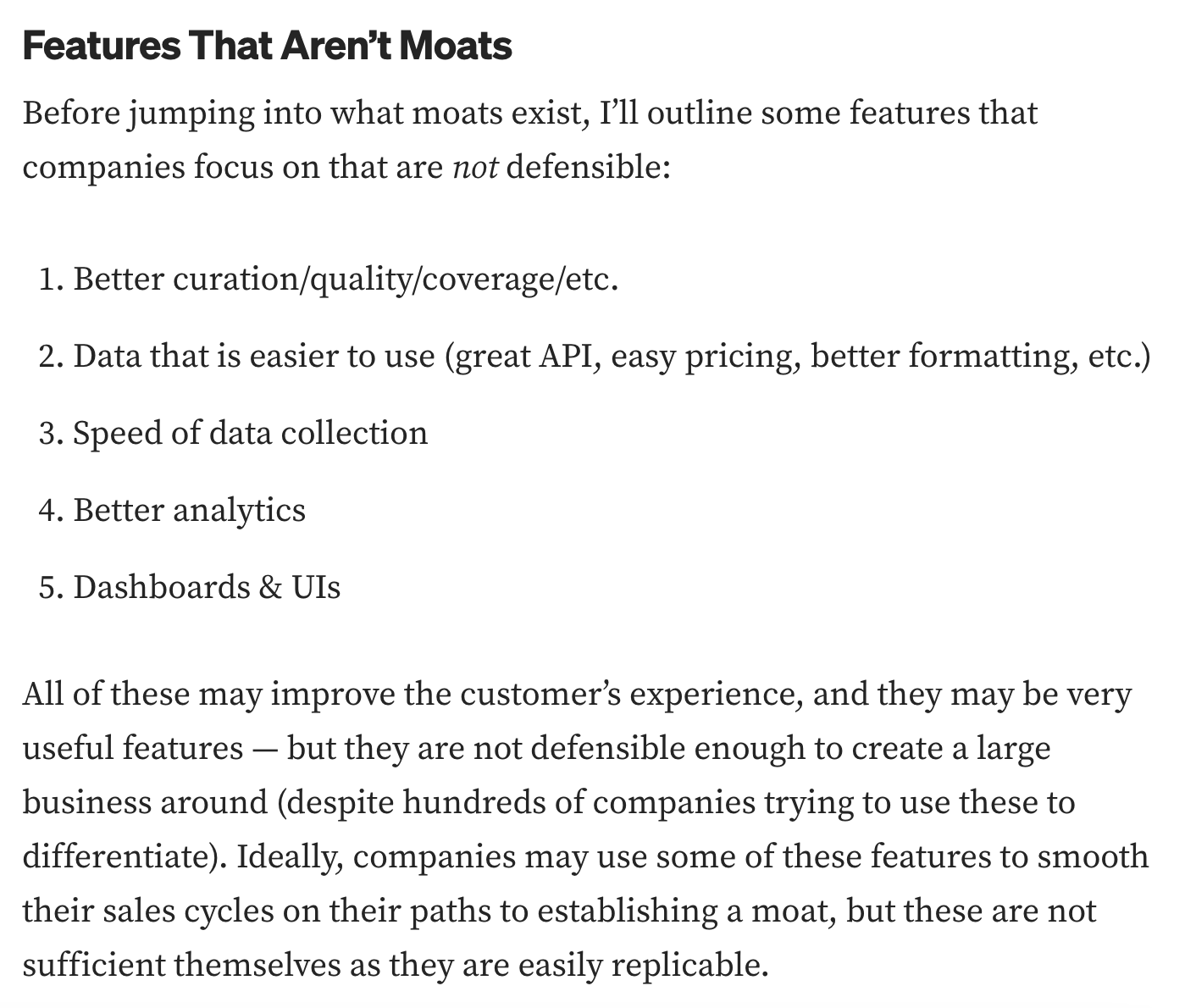 Travis Mayâs âthe six moats of data businessesâ talks of the different moats that exist in data businesses.Â