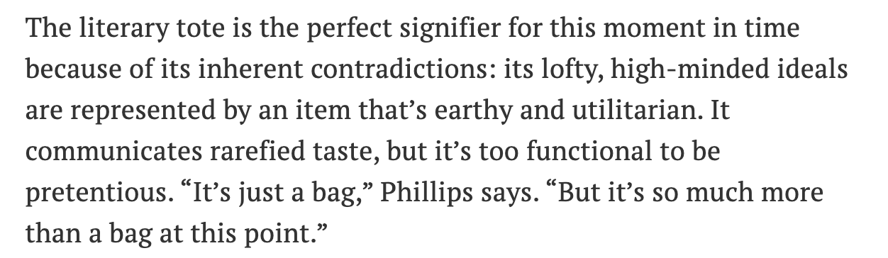 Our tote bags, ourselves: How a humble bag became a humble brag. By Maija Kappler